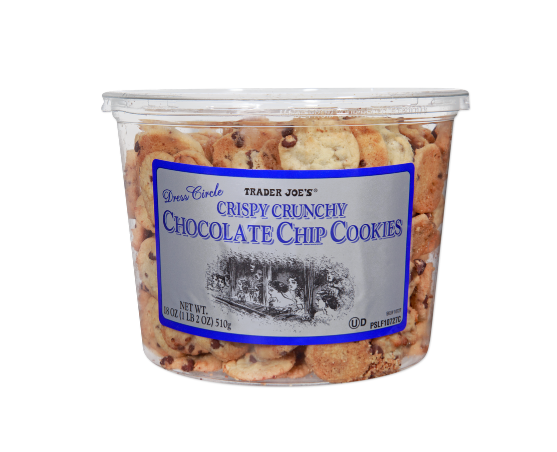Baby cookies. Baaaby. About the size of a quarter, crunchy, baby chocolate chips, and perfectly crunchy, don’t shame yourself if you empty half of the tub without blinking; it happens.